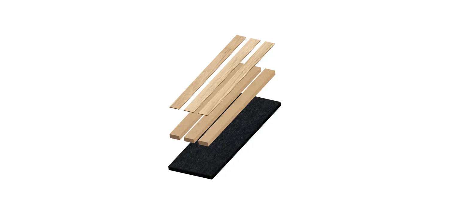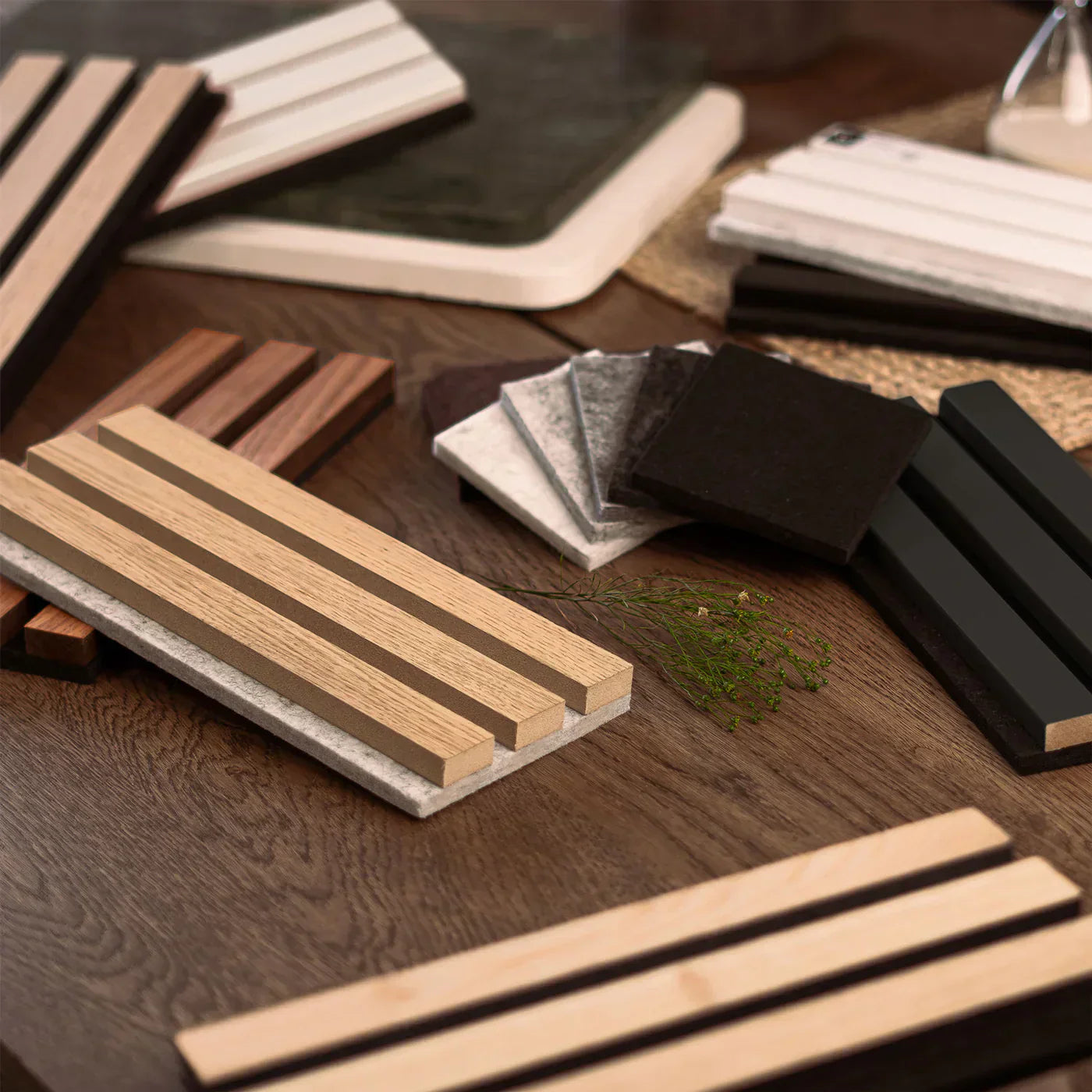 モラダラメラパネルは、天然木突板、MDF、リサイクルアコースティックフェルトの層を組み合わせており、すべての詳細において美学、機能性、持続可能性を提供します。